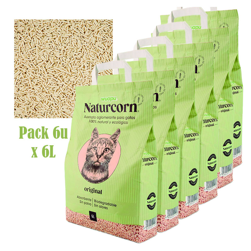 Caja de sustrato de maíz triturado Naturcorn, para una limpieza fácil y un ambiente fresco. Aglomera desechos y neutraliza olores. Biodegradable y seguro para el inodoro. Disponible en dos presentaciones: 6 sacos de 6 litros y 3 sacos de 17,5 litros.